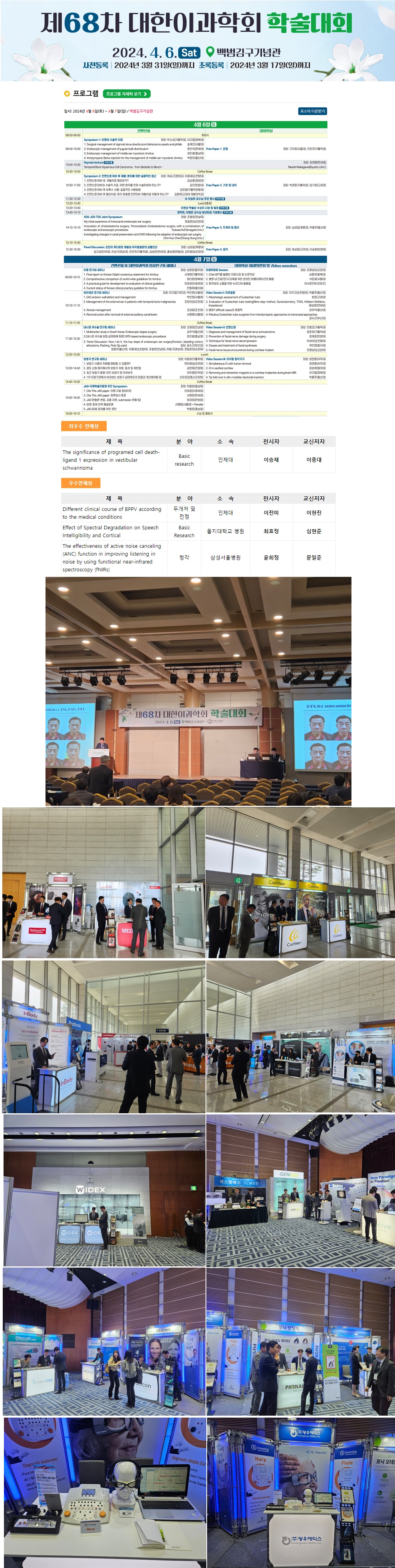 광우메딕스(주)는 2024년도 제68차 대한이과학회 학술대회에 참석하여 자리를 빛내주었습니다. 대한이과학회는 4월 6일(토)-7일(일) 양 일간 진행하기로 예정되었으나 최근 의료계 사태로 인해 4월 6일 토요일 하루로 축소하여 진행하게 되었습니다. 4월 6일 프로그램은 예정대로 진행하였으나 구연 발표는 진행하지 않고 포스터 전시로 대체되었으며 4월 7일 프로그램은 의료계 사태 해결한 뒤 따로 진행하거나 또는 내년 2025년도에 이과학회 학술대회로 순연하여 진행할 예정이라고 하였습니다. |